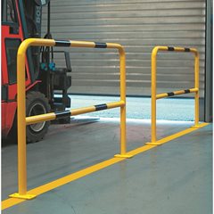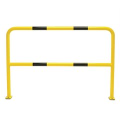 Stahl-Schutzbügel zum Sichern von Gefahrenzonen. Für innen und außen. Zur Absicherung von Personenverkehr, Maschinenschutz, Abtrennung von gefahrgeneigten Arbeitsbereichen. Gebogenes Stahlrohr mit zusätzlicher Knieleiste. Gelb beschichtet, schwarze Signalstreifen. Rohr: Ø 48 mm, Wandstärke 2 mm. Zum Aufdübeln: Bodenplatten 70 x 160 x 10 mm.