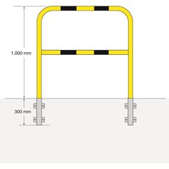 Stahl-Schutzbügel zum Sichern von Gefahrenzonen. Für innen und außen. Zur Absicherung von Personenverkehr, Maschinenschutz, Abtrennung von gefahrgeneigten Arbeitsbereichen. Gebogenes Stahlrohr mit zusätzlicher Knieleiste. Gelb beschichtet, schwarze Signalstreifen. Rohr: Ø 48 mm, Wandstärke 2 mm. In Kombination mit zwei Einsteckhülsen (Zubehör) auch als herausnehmbare Variante (für die Wandmontage).