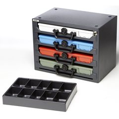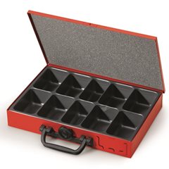 Stapelturm mit 4 Sortimentskoffern, Einleger mit 10fach-Einteilung, Koffer farbig sortiert. Aus Stahlblech. Gesamtpaket aus Stapelturm, Sortimentskoffer, Einleger und Kofferetiketten. Kugelgelagerte Teleskop-Vollauszüge. Umweltfreundlich pulverbeschichtet. Ergonomische Kunststoffgriffe. Einleger individuell wählbar. Zur Wandmontage geeignet. Stapelturm und Koffer aus hochwertigem, pulverbeschichtetem Stahlblech. Stapelturm in Anthrazitgrau RAL 7016. Mit Sicherheitsschloss inkl. 2 Schlüsseln. Koffer mit Drehverschluss, Schaumstoff-Presspolster im Deckel und Schilderleiste. Einleger aus schwarzem Polystyrol. Lieferumfang Stapelturm. 4 Koffer. 4 Einleger gemäß Skizze. Befestigungsmaterial zur Wandmontage. Stapelturm-Außenmaße Höhe x Breite x Tiefe 319x410,5x259 mm. Sortimentskoffer-Außenmaße Höhe x Breite x Tiefe 52x332x232 mm.