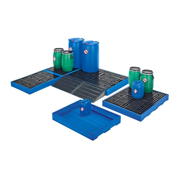 Zum vorschriftsmäßigen Lagern und Abfüllen von Kleingebinden, 60- und 200-Liter-Fässern, Batterien etc. Niedrige Bauhöhe - nur 150 mm - mit Fasskarre befahrbar. Einzeln und als Flächenschutz nutzbar. Mit Allgemeiner bauaufsichtlicher Zulassung des DIBt, Berlin. Komplett aus Polyethylen - hochbeständig gegen Öle, Säuren, Laugen etc. Robuste, langlebige Konstruktion.