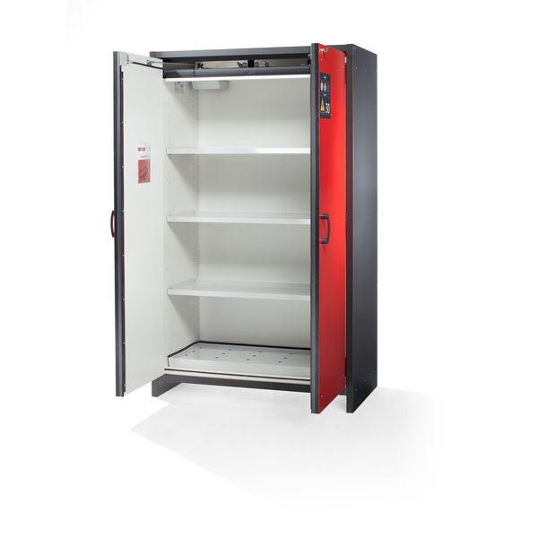 Mit Stahlblechtüren. Zur vorschriftsmäßigen Lagerung entzündbarer Medien in Arbeitsräumen nach DIN EN 14470-1 und TRGS 510, Anlage 3 (Typ 30). Feuerwiderstandsfähigkeit 30 Minuten typgeprüft, brandschutzgeprüft. Türen arretieren in jedem Öffnungswinkel. Offenstehende Türen im Brandfall selbstschließend. Fest integrierter Transportsockel für einfachen innerbetrieblichen Transport. Türen abschließbar mit Profilzylinder (schließanlagenfähig).