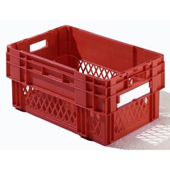 Drehstapelkasten, Inhalt 49 Liter, Wände durchbrochen, Boden geschlossen, VE 4 Stk, rot. Aus Polypropylen. Stapellast 500 kg. Verstärkter Rippenboden für hohe Traglasten. Temperaturbeständig von -20 °C bis +90 °C. Auch mit Deckel stapelbar. Verpackungseinheit (VE) 4 Stück. Zubehör Deckel, Etiketten (passend für integrierte Etikettenhalter) und Plomben. Bitte bei Bedarf extra bestellen.