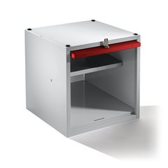 Tür nach oben einschiebbar - keine störenden Türflügel. Herausnehmbarer, mittiger Einlegeboden. Mit Etikettenhalter (Höhe x Breite 22 x 74 mm).