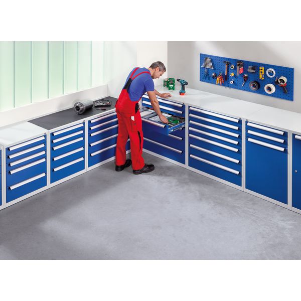 Stabile, pulverbeschichtete Stahlkonstruktion. Korpus in Lichtgrau RAL 7035. Fronten enzianblau RAL 5010. Schubladen auf leichtgängigen Teleskopführungen 100% ausziehbar, für optimalen Zugriff - auch auf die hinten gelagerten Teile. Aluminium-Griffleiste mit Beschriftungsmöglichkeit. Zentralverschluss mit Zylinderschloss. Tiefe 600 mm.