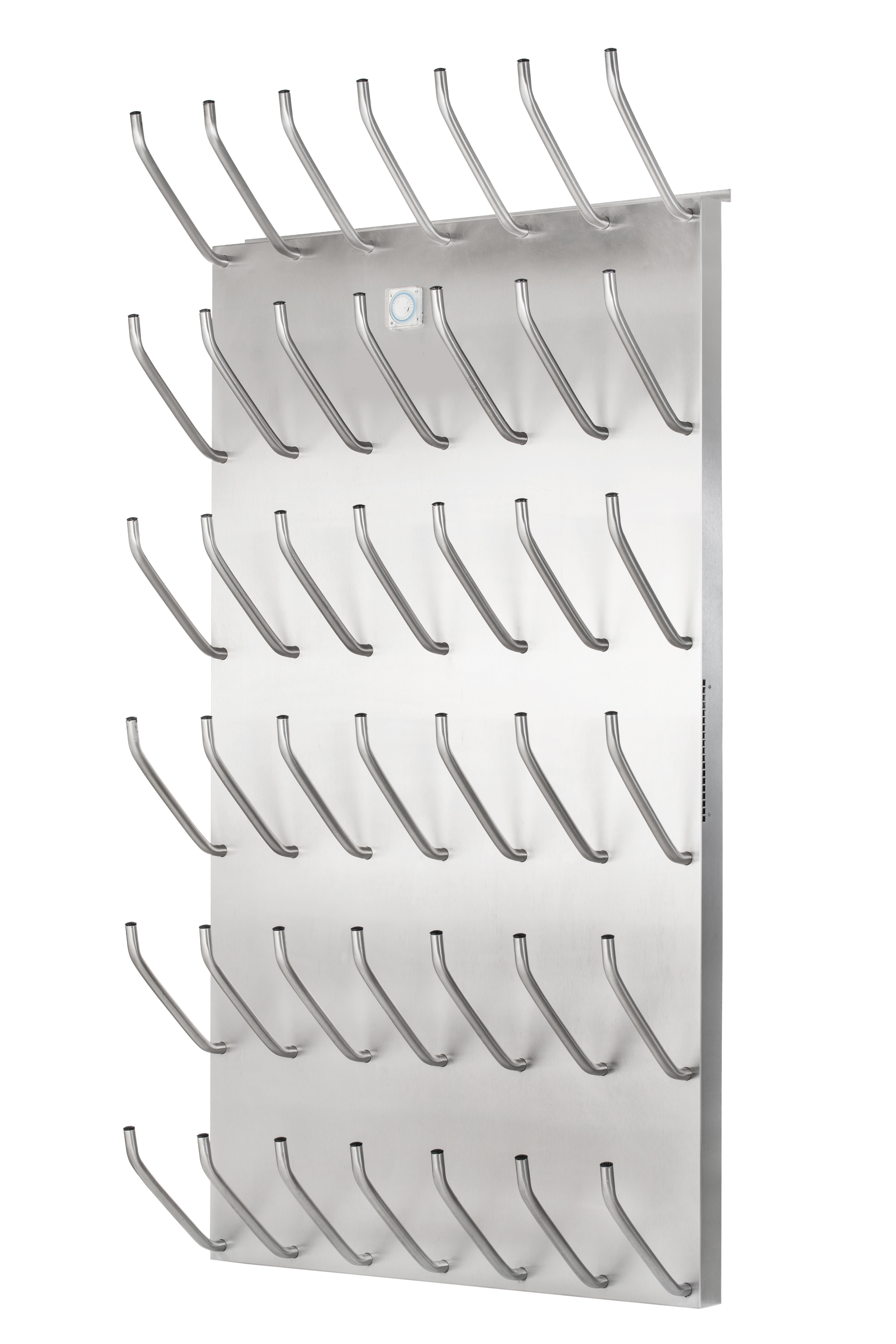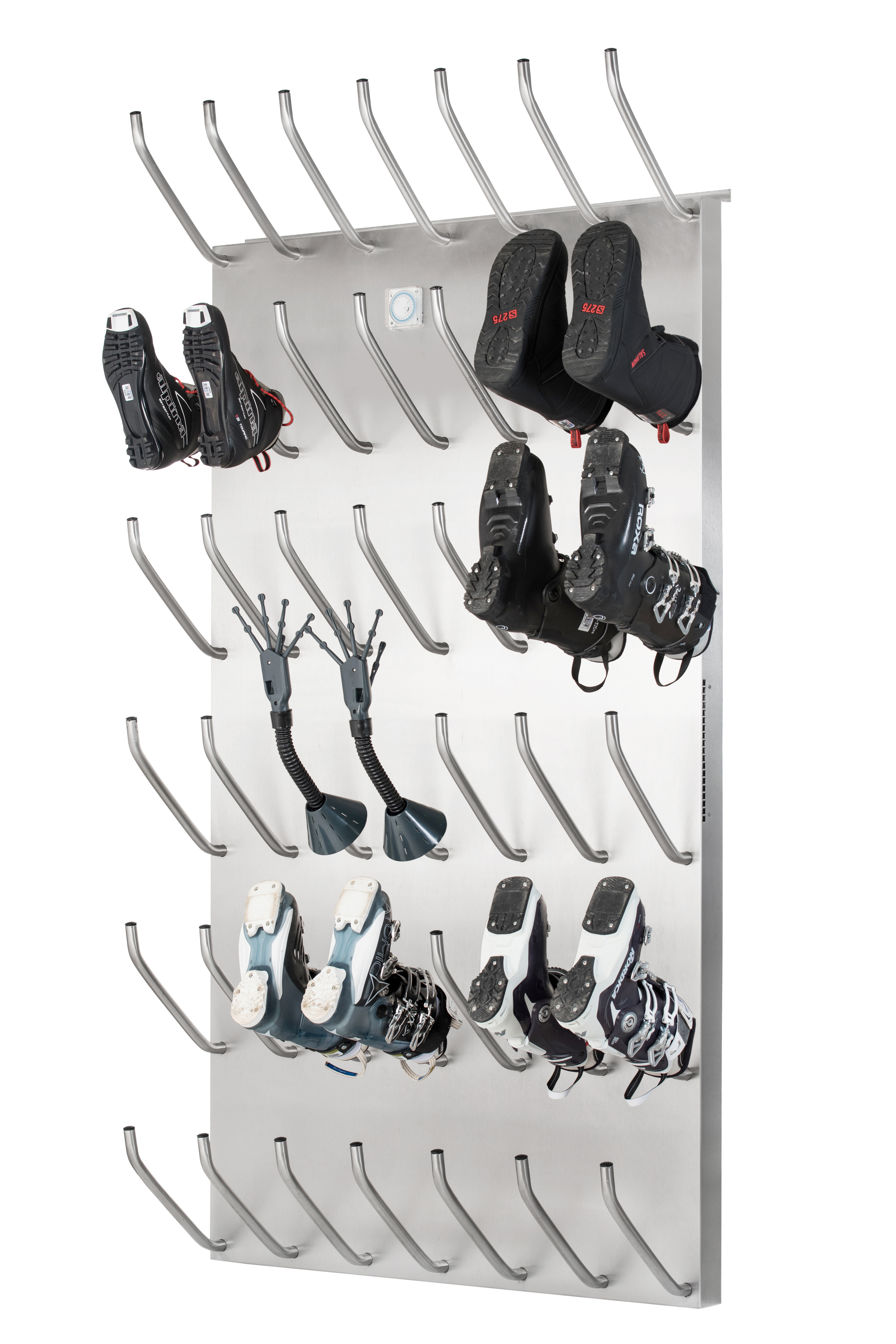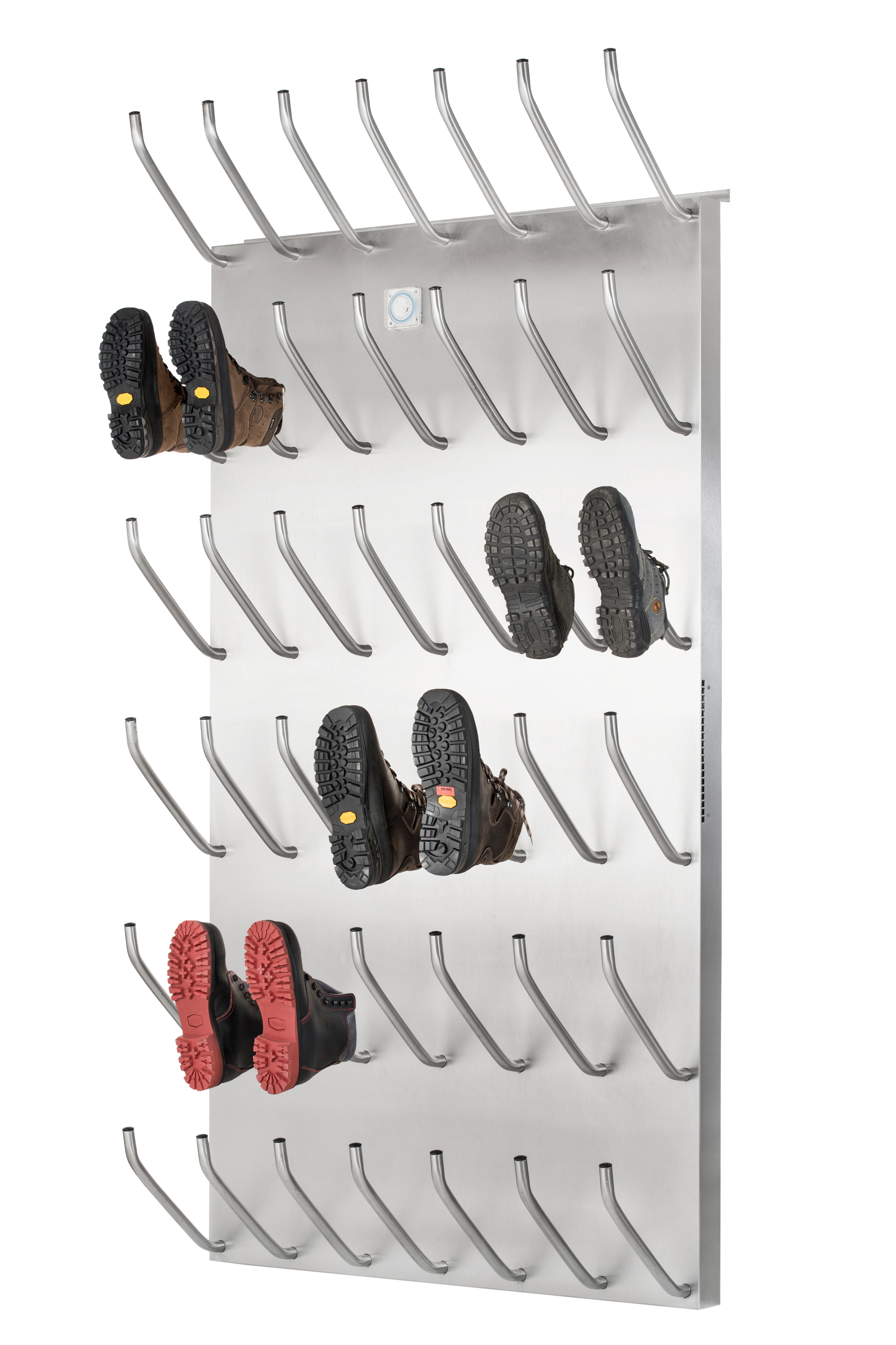 OSMA Schuhtrockner, Stiefeltrockner und Handschuhtrockner aus Edelstahl für 12 Paar. Die Alternative zum Warmlufttrockner. Die Rohrbügel werden elektrisch beheizt, ohne Gebläse. Anschlusswert: 230 Volt, 170 Watt. CE-geprüft. Höhe: 1030 mm, Breite: 1270 mm, Tiefe: 380 mm.