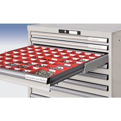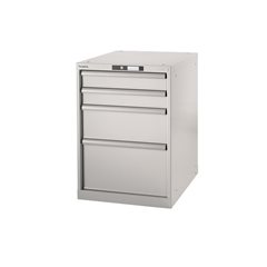 Stabile, pulverbeschichtete Stahlblechkonstruktion. Zentralverschluss durch Zylinderschloss. Schubladen 100% ausziehbar, Tragkraft 75 kg. Perfekte Laufruhe durch den traversenlos geführten Differenzialauszug.