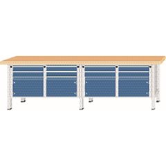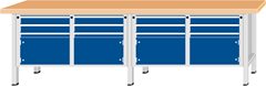 Werkbank Breite 2800 mm, Gestellbauweise, 4 Türen, 8 Schubladen, Buchemassivplatte.