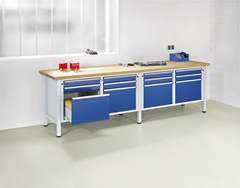 Werkbank Breite 2800 mm, Gestellbauweise, 4 Türen, 8 Schubladen, Buchemassivplatte. Schubladen... mehr