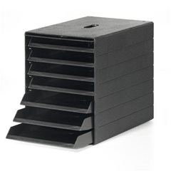 Schubladenbox, HxBxT 322x250x365 mm, schwarz. Mit Staubschutz. Schubladenbox mit versenkbarer Frontplatte für die Aufbewahrung von schriftlichen Unterlagen bis Format C4. Mit sieben offenen Schubladen. Zur Nutzung auf dem Schreibtisch und zur Untertisch- oder Wandmontage. HxBxT 322x250x365 mm.
