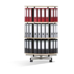 Etagen im Ganzen drehbar . Leichter geräuschloser Lauf, müheloses Drehen der Etagen durch Kugellagerung. Zur Unterbringung von ca. 80% mehr Ordnern gegenüber vergleichbaren Regalen.