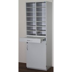 Korpus aus stabiler, melaminharzbeschicheter Möbelplatte, 19 mm stark. Die Rückwand ist ebenfalls beschichtet, daher ist dieser Schrank auch als Raumteiler einsetzbar. Robuster Stahlsockel, 46 mm hoch, mit höhenverstellbaren Gleitern. Alle Fachböden sind im 32-mm-Raster verstellbar. Mit zusätzlichen Fächern für die optimale Postsortierung. Sortierfächer für DIN A4, Breite x Tiefe 279 x 380 mm. Standardfachhöhe 115 mm, durch Zusatzfachböden beliebig verringerbar. Stabile, auf Teleskopschienen laufende Sortierauszüge mit einer Tragkraft von 40 kg und Arretierung in geschlossener Position. Abschließbarer Unterschrank mit Türe, Zylinderschloss (2 Schlüssel).
