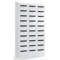 Hochwertige Einbrennlackierung. Korpus immer Lichtgrau RAL 7035. Verschließbar mit Zylinderschloss, je Schloss 2 Schlüssel. Fach-Innenmaße: Höhe 190 mm, Breite 348 mm, Tiefe 470 mm.