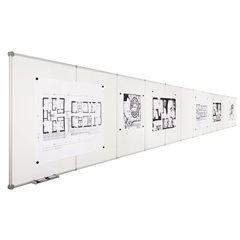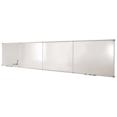 Endlos-Board, Stahlblech, emailliert, Querformat, Grundmodul. Für endlos viel Platz sorgt dieses unendlich erweiterbare Tafelsystem. Beginnend mit dem Grundmodul-Set (bestehend aus einem Anfangsmodul und einem Endmodul) kann durch das Einfügen von Erweiterungsmodulen das Grundmodul-Set beliebig erweitert werden. Die einzelnen Module haben einen ansprechenden, silbereloxierten Aluminiumrahmen mit dekorativen, platingrauen Kunststoffecken. Das Grundmodul-Set wird mit zwei verschiebbaren Ablageschalen geliefert. Komfortable, zeitsparende Befestigung mittels Exzenter-Elementen, die eine exakte Horizontalausrichtung auch nach der Montage zulassen. Bei Querformat hat das Grundmodul-Set die Außenmaße (Breite x Höhe) von 2400x900 mm und kann mit einem Erweiterungsmodul jeweils um 1200 mm in der Breite endlos verlängert werden. Die emaillierte Oberfläche hat durch das Einbrennen der Emailschicht eine extrem lange Lebensdauer. Die Oberflächen sind magnethaftend, mit Boardmarkern beschriftbar und trocken abwischbar. Eine Kombination der drei verschiedenen Arbeitsflächen ist möglich. Die kombinierte Verwendung von Modulen im Hochformat und Querformat ist nicht möglich. Sonderanfertigungen auf Anfrage.