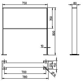- Maße mit Befestigungsplatte (B x T x H): 780 x 150 x 800 mm