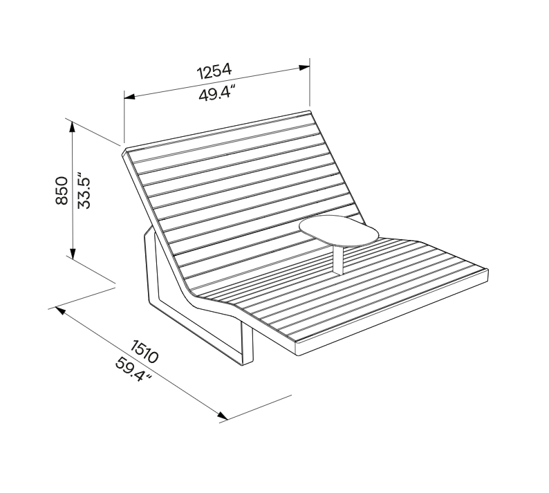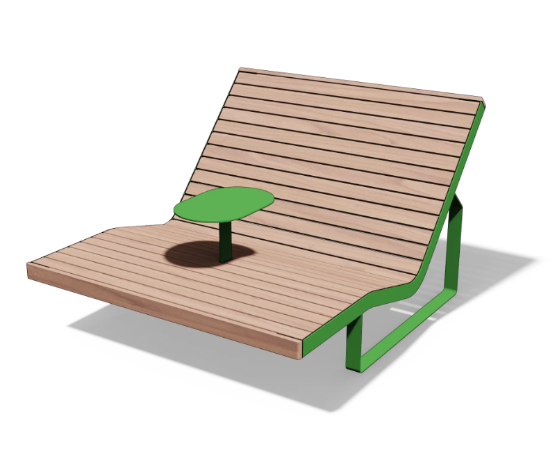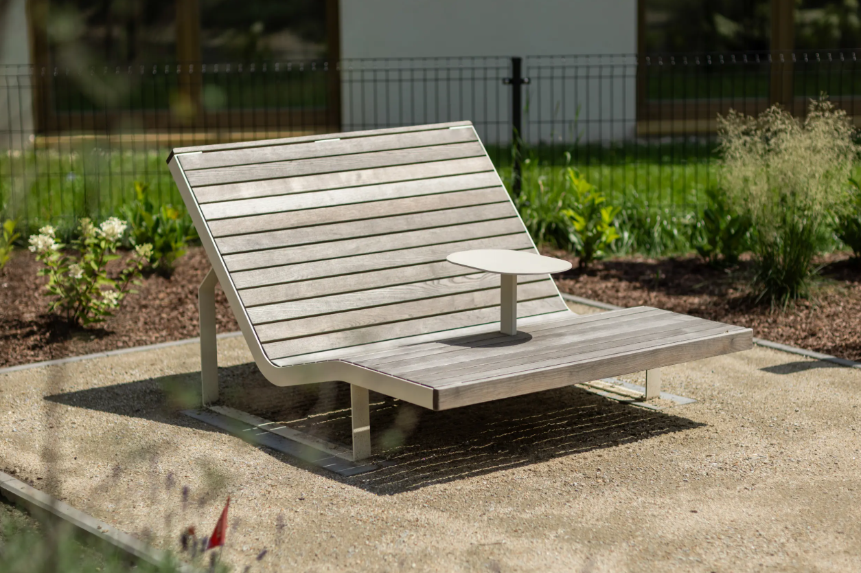 Der Stahlrahmen des Doppelliegestuhls ist mit Holzlatten ummantelt, die mit Befestigungselementen aus Edelstahl versehen sind.