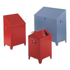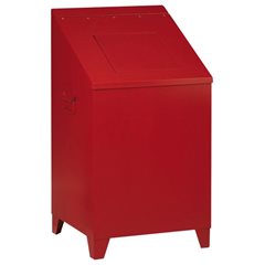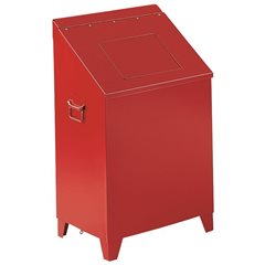Putzwollkasten aus Stahlblech, mit selbstschließendem Einwurf, feuerrot, Volumen 120 l. Selbstschließende Einwurfklappe. Der klassische Sammelbehälter für Putzwolle - auch für andere Abfälle bestens geeignet. Aus lackiertem Stahlblech, gekantet und geschweißt, zwei seitliche Fallgriffe zum einfachen Transport. Selbstschließende Einwurfklappe, dadurch feuer- und geruchshemmend. Lackierung feuerrot RAL 3000. Bei verschließbarer Variante: Vorrichtung für Hängeschloss vorhanden.