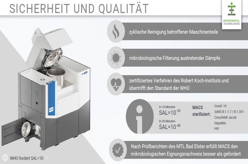 Die Technologie von MACS ist ein zertifiziertes Verfahren des deutschen Robert Koch-Instituts und erzielt einen Sterility Assurance Level von bis zu SAL = 10 hoch -48. Dabei übertreffen MACS die Vorgaben der WHO (SAL = 10 hoch -6) um ein Vielfaches.