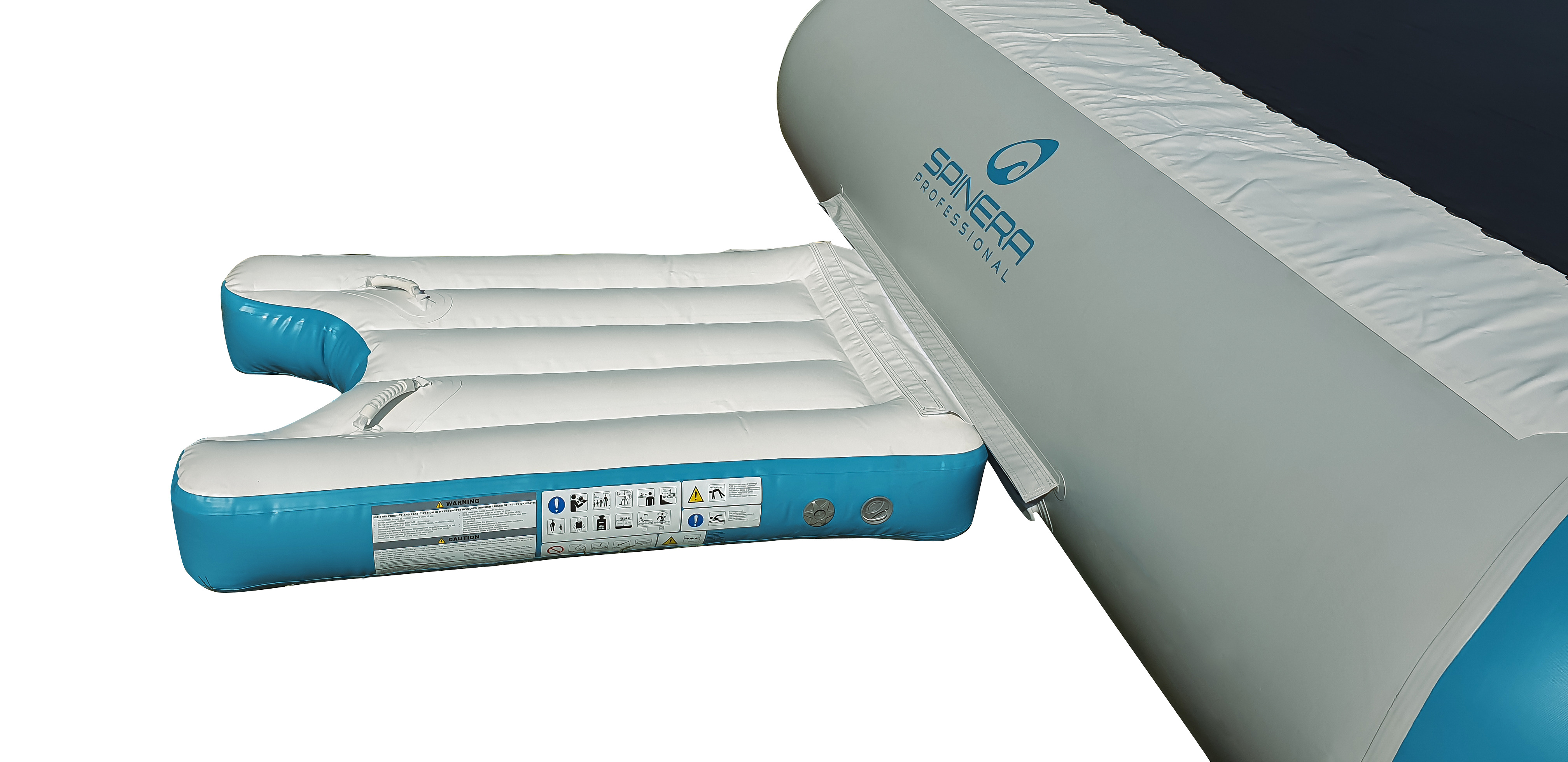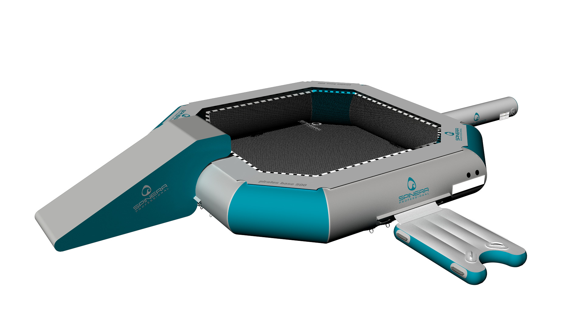 Mit dem Spinera Wassertrampolin "Pirates Tramp 500" ergänzen Sie nicht nur Wasserparks bestmöglich. Auch einzeln sorgt dieses Wassergroßgerät für zufriedene Badegäste. Sie erhalten das Trampolin in der Ausführung mit dem Element Base Step, wodurch der Aufstieg aus dem Wasser heraus erleichtert wird sowie in der Variante mit zusätzlicher Rutsche und Balancierelement Base Beam. Dank Tragegriffen transportieren Sie das Aquapark-Gerät auch aufgepumpt leicht zur richtigen Position. Mittels 4 Ankerpunkten sichern Sie das Eventmodul zuverlässig in Becken oder Gewässern mit einer Mindestwassertiefe von 2,4 m.