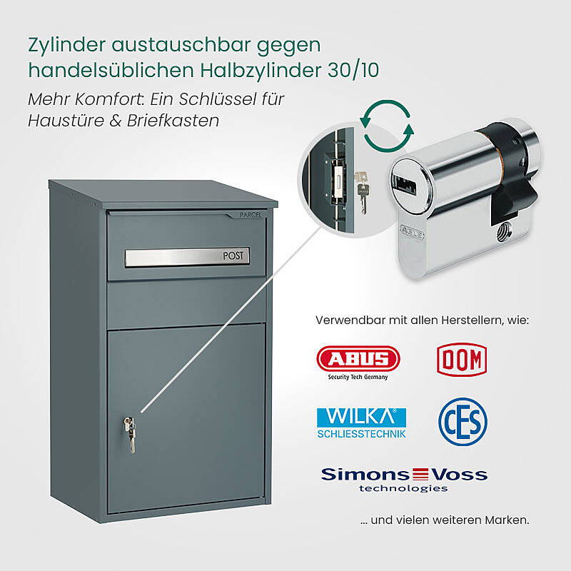 Flexible Schließoptionen: Dieser Sicherheitsbriefkasten ist perfekt anpassbar. Er kann mit einem handelsüblichen Halbzylinder (A30/I10) ausgestattet werden, der sich ideal für die Gleichschließung mit bereits vorhandenen Türen eignet - somit können Sie Alles mit nur einem Schlüssel bedienen! Optional lässt er sich auch mit einem elektronischen Schließzylinder, wie z.b. ABUS Wapploxx oder SimonsVoss MobileKey, nachrüsten.