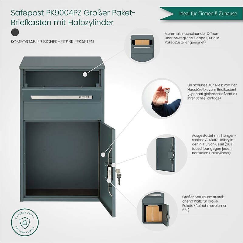 Safepost PK9004PZ - Großer Paketkasten - Briefkasten mit Halbzylinder - sicherer & komfortabler Paketempfang für Ihr Unternehmen, Geschäft, Büro, Zuhause