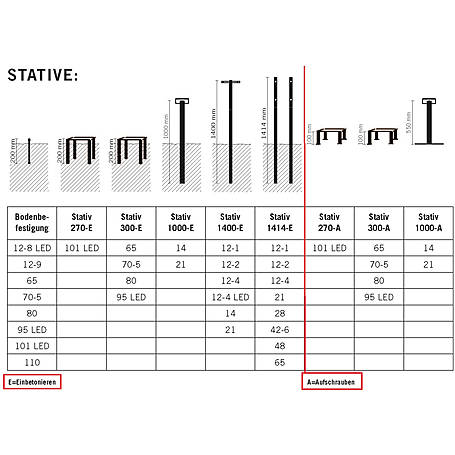 Eine weitere Möglichkeit ist das Stativ 300 (E Einbetonieren oder A Aufschrauben) zu nutzen, um eine erhöhte Aufstellposition zu erreichen.