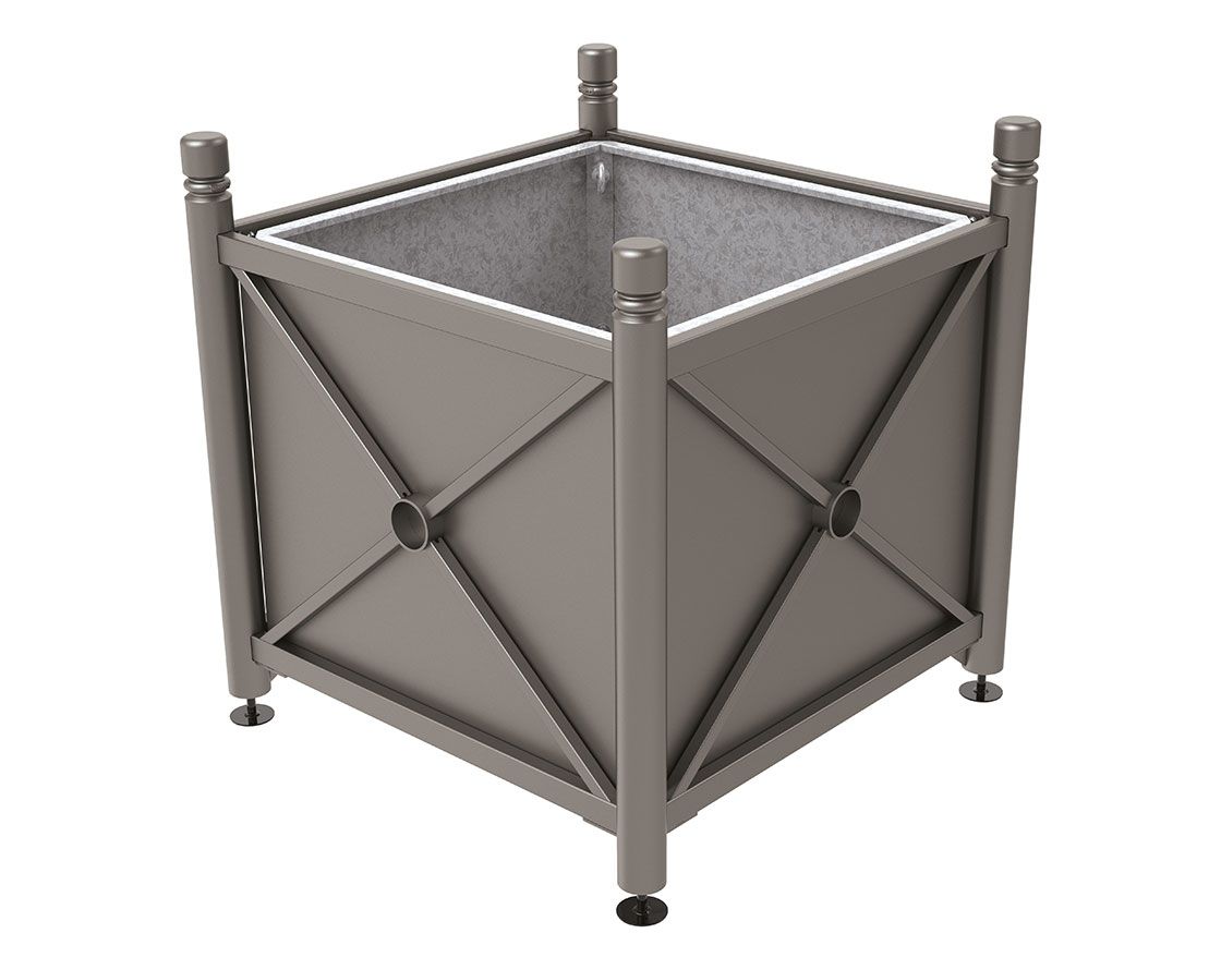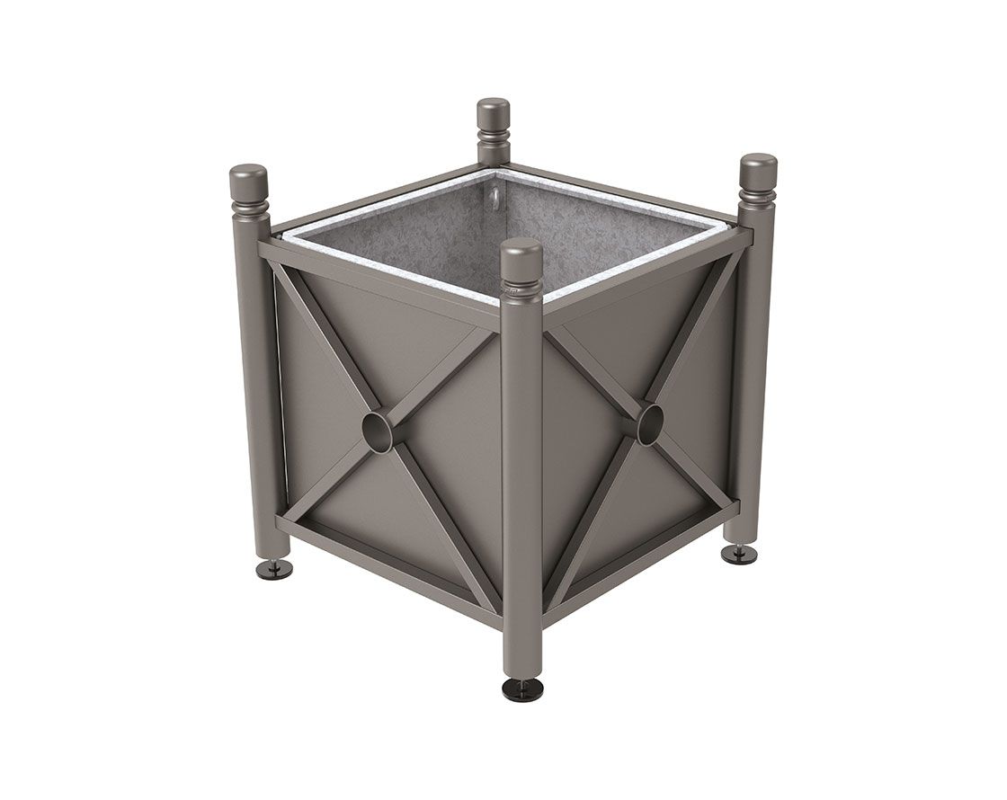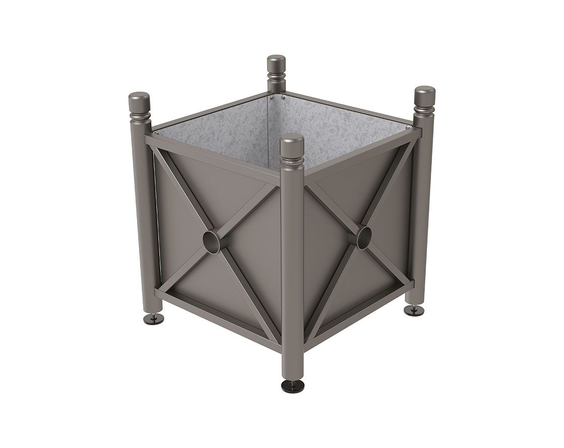 Ein klassisch auftretender Pflanzbehälter, der in zwei Fertigstellungen (100% Stahl oder Stahl & Holz) erhältlich ist und die Möglichkeit bietet, ihn mit einem dekorativen Kopf individuell zu gestalten.