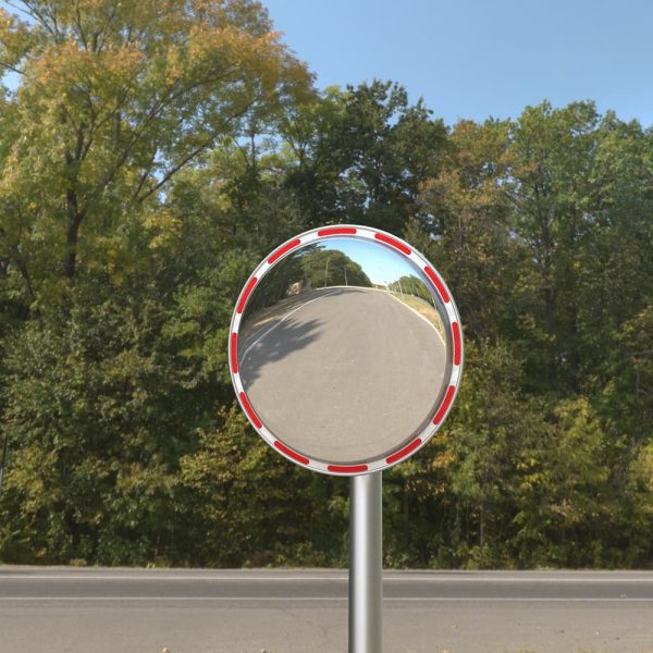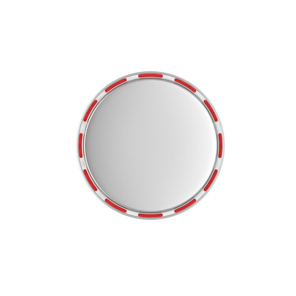 - Edelstahl-Verkehrsspiegel Mini, mit Edelstahl-Rückseite, mit rot-silber-reflektierendem Rand.