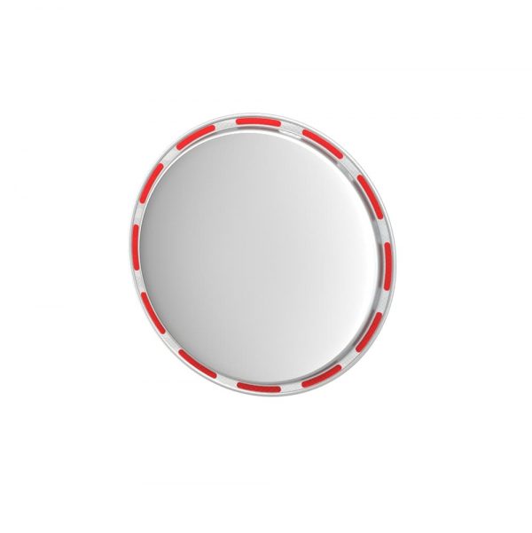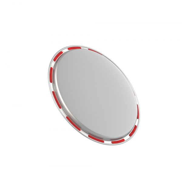 - Edelstahl-Verkehrsspiegel Mini, mit Edelstahl-Rückseite und rot-silber-reflektierendem Rand.